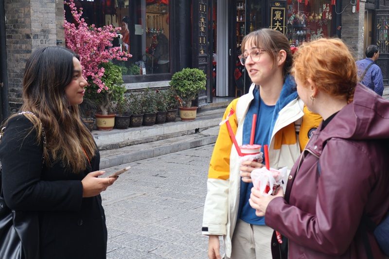 各小组的留学生们在平遥古城积极寻觅外国游客,通过采访开展跨文化互动与实地调查,并向外国游详细推介了北外国商的来华留学项目。来自墨西哥的留学生伊万娜表示,“我们是留学生的身份,此刻我们是晋商文化的传递者,在与当地的外国游客采访交流后,我们彼此都对晋商文化有了更加深刻的认识。同时,我们给每一位受访者都准备了一个精美礼包,里面有北外国商来华留学的英文招生手册,我们积极向外国友人们推广自己的学校,让更多人了解来华留学的意义和价值。”